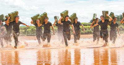 中隊官兵扛著彈藥箱在泥水中訓練沖刺。本報記者 金 歆攝