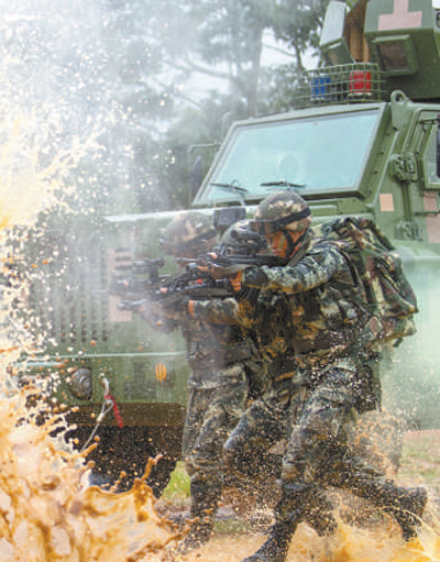 中隊官兵扛著彈藥箱在泥水中訓練沖刺。記者 金 歆攝