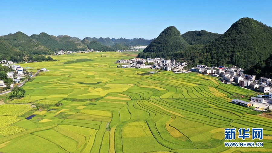 8月26日拍攝的貴州省安龍縣招堤街道海莊村的稻田景色(無人機照片)。 時下,浙江、湖南、貴州等地水稻陸續(xù)進(jìn)入成熟期,豐收在望。 新華社發(fā)(劉朝富 攝)