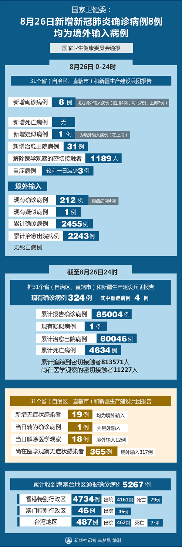 截至8月26日24時,據(jù)31個?。ㄗ灾螀^(qū)、直轄市)和新疆生產(chǎn)建設(shè)兵團(tuán)報(bào)告,現(xiàn)有確診病例324例(其中重癥病例4例),累計(jì)治愈出院病例80046例,累計(jì)死亡病例4634例,累計(jì)報(bào)告確診病例85004例,現(xiàn)有疑似病例1例。累計(jì)追蹤到密切接觸者813571人,尚在醫(yī)學(xué)觀察的密切接觸者11227人。