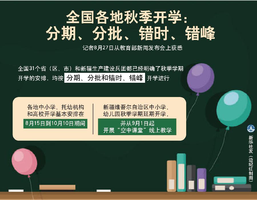 教育部應(yīng)對(duì)新冠肺炎疫情工作領(lǐng)導(dǎo)小組辦公室主任、體育衛(wèi)生與藝術(shù)教育司司長(zhǎng)王登峰介紹說,各地中小學(xué)、托幼機(jī)構(gòu)和高校開學(xué)基本安排在8月15日到10月10日期間。新疆維吾爾自治區(qū)中小學(xué)、幼兒園秋季學(xué)期延期開學(xué),并從9月1日起開展“空中課堂”線上教學(xué)。