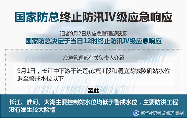 新華社北京9月2日電(記者劉夏村)記者2日從應急管理部獲悉,國家防總決定于當日12時終止防汛Ⅳ級應急響應。