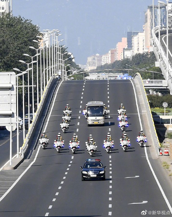 國家勛章和國家榮譽(yù)稱號(hào)獲得者集體乘坐禮賓車從住地出發(fā),由國賓護(hù)衛(wèi)隊(duì)護(hù)衛(wèi)前往人民大會(huì)堂。