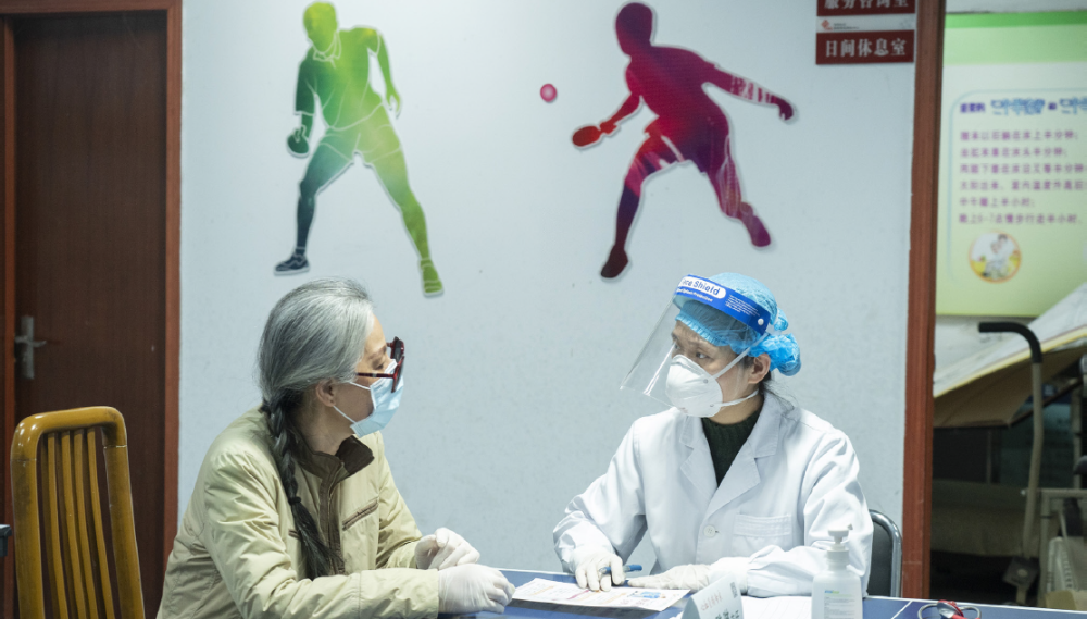 4月14日,在武漢市江岸區(qū)花橋街花橋社區(qū)居家養(yǎng)老服務中心,武漢亞洲心臟病醫(yī)院醫(yī)護人員在為社區(qū)老人義診 (才揚/攝)