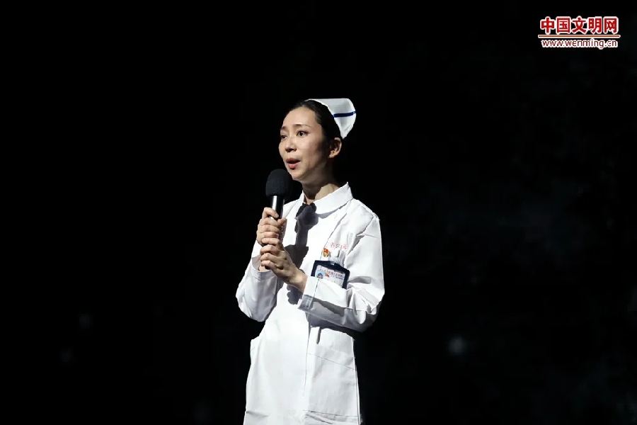 華東醫(yī)院外科重癥監(jiān)護(hù)室護(hù)士長(zhǎng)、上海第一批援鄂醫(yī)療隊(duì)隊(duì)員陳貞現(xiàn)場(chǎng)講述“抗疫”故事。中國(guó)文明網(wǎng) 趙洋 攝