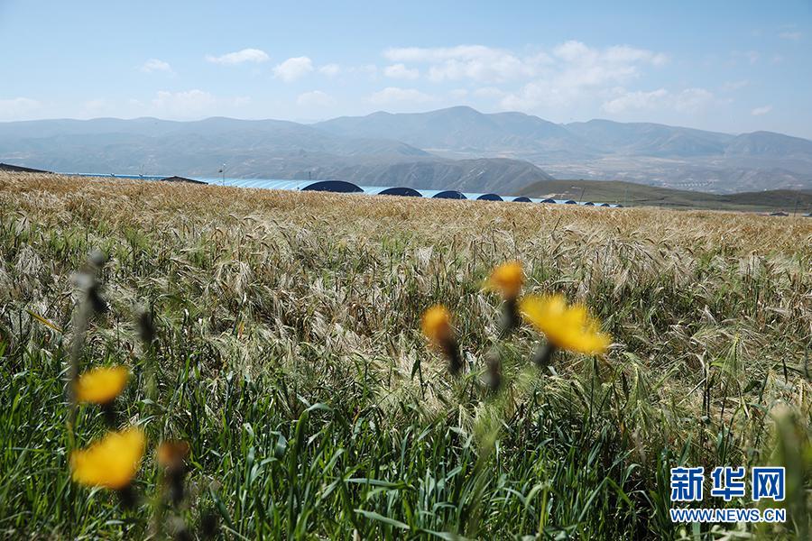 東達(dá)村的青稞迎來豐收,遠(yuǎn)處藍(lán)色頂棚建筑是東達(dá)村養(yǎng)殖場。新華網(wǎng)記者焦鵬攝
