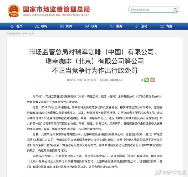 2020年9月18日,市場監(jiān)管總局及上海、北京市場監(jiān)管部門,對瑞幸咖啡(中國)有限公司、瑞幸咖啡(北京)有限公司及北京車行天下咨詢服務有限公司、北京神州優(yōu)通科技發(fā)展有限公司、征者國際貿(mào)易(廈門)有限公司等45家涉案公司作出行政處罰決定,處罰金額共計6100萬元。