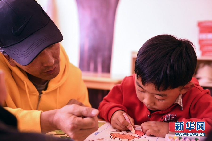 9月17日,青海省果洛藏族自治州瑪沁縣拉加鎮(zhèn)中心幼兒園的老師輔導孩子們上美術課。(新華網(wǎng)潘彬彬 攝)