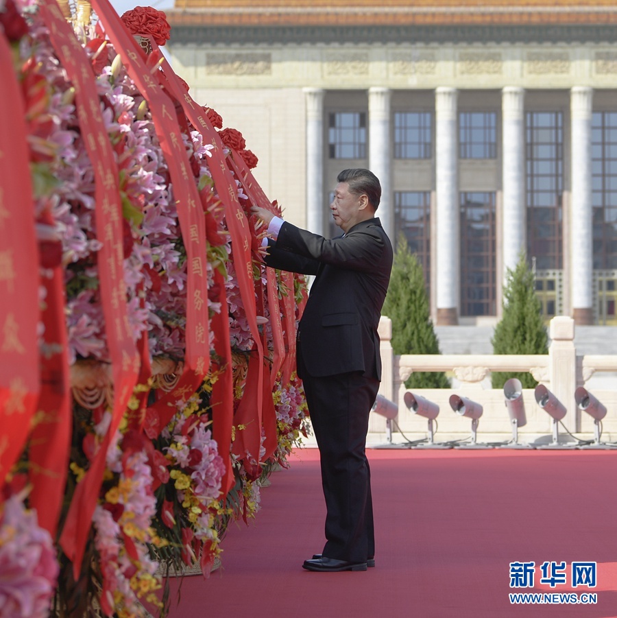 9月30日上午,黨和國(guó)家領(lǐng)導(dǎo)人習(xí)近平、李克強(qiáng)、栗戰(zhàn)書(shū)、汪洋、王滬寧、趙樂(lè)際、韓正、王岐山等來(lái)到北京天安門(mén)廣場(chǎng),出席烈士紀(jì)念日向人民英雄敬獻(xiàn)花籃儀式。這是習(xí)近平整理花籃上的緞帶。 新華社記者 申宏 攝