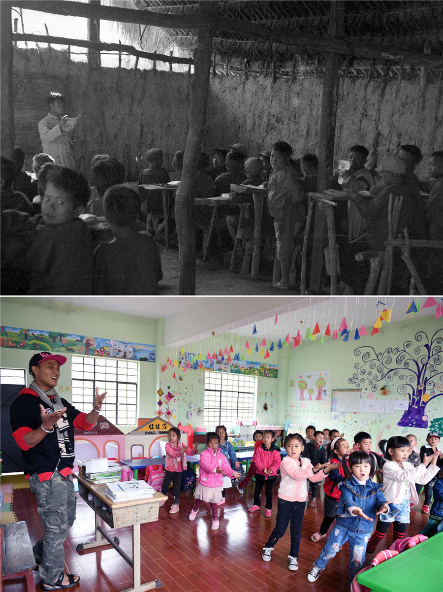 拼版照片:上圖為1954年,在云南省普洱市西盟佤族自治縣創(chuàng)辦的第一所小學(xué)——西盟小學(xué),老師帶領(lǐng)孩子讀書學(xué)習(xí)(資料照片);下圖為2018年12月7日,云南省普洱市西盟佤族自治縣勐梭鎮(zhèn)班母村佤山育忠幼兒園的孩子跟著老師巖科上音樂課。1986年出生的巖科是班母村佤族寨人。他說,我的阿媽小時(shí)候沒有進(jìn)過一天學(xué)堂,現(xiàn)在,佤山的孩子們都在寬敞明亮的教室里學(xué)習(xí)(新華社記者楊宗友攝)。新華社發(fā)
