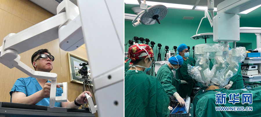 左圖:9月24日,在青島大學(xué)附屬醫(yī)院,醫(yī)院副院長、教授牛海濤使用新一代國產(chǎn)原研手術(shù)機(jī)器人——“妙手”為貴州省安順市的患者實(shí)施超遠(yuǎn)程手術(shù)。新華社記者 李賀 攝