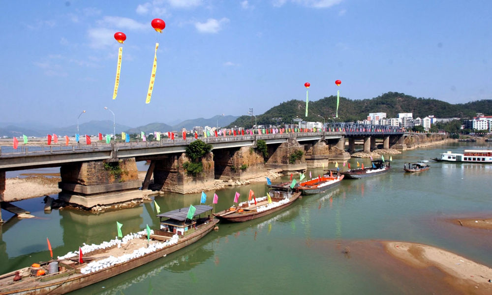 ↑?2007年重修中的廣濟(jì)橋和中段“十八梭船”啟閉式浮橋