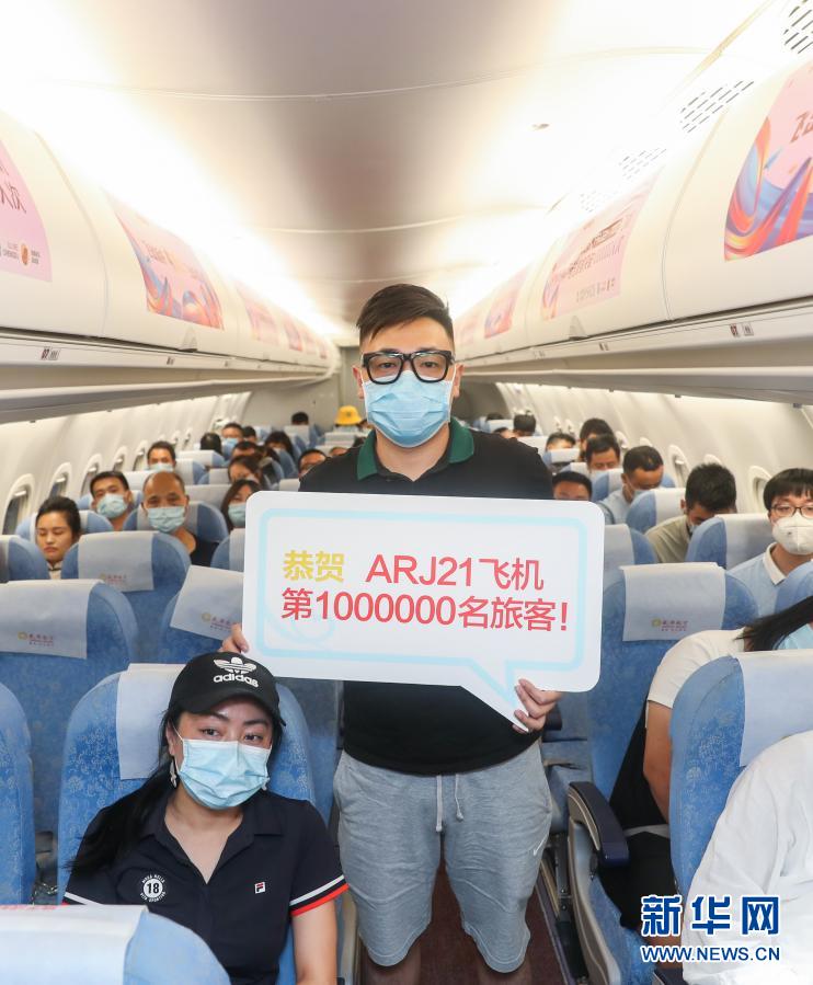 7月20日晚,ARJ21飛機(jī)的第100萬名乘客在機(jī)艙內(nèi)拍照留念。該架飛機(jī)從上饒三清山機(jī)場起飛,在成都雙流機(jī)場降落。新華社記者 丁汀 攝