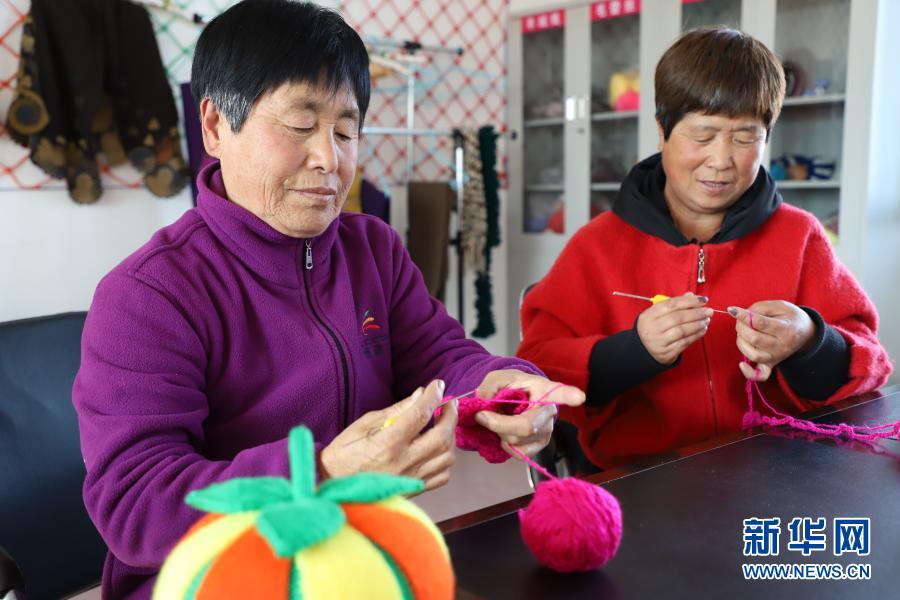 10月29日,在黑龍江省鶴崗市綏濱縣忠仁鎮(zhèn)黎明村的編織工作室,李明鴿(左)輔導(dǎo)村民做手工編織。新華社記者 徐凱鑫 攝