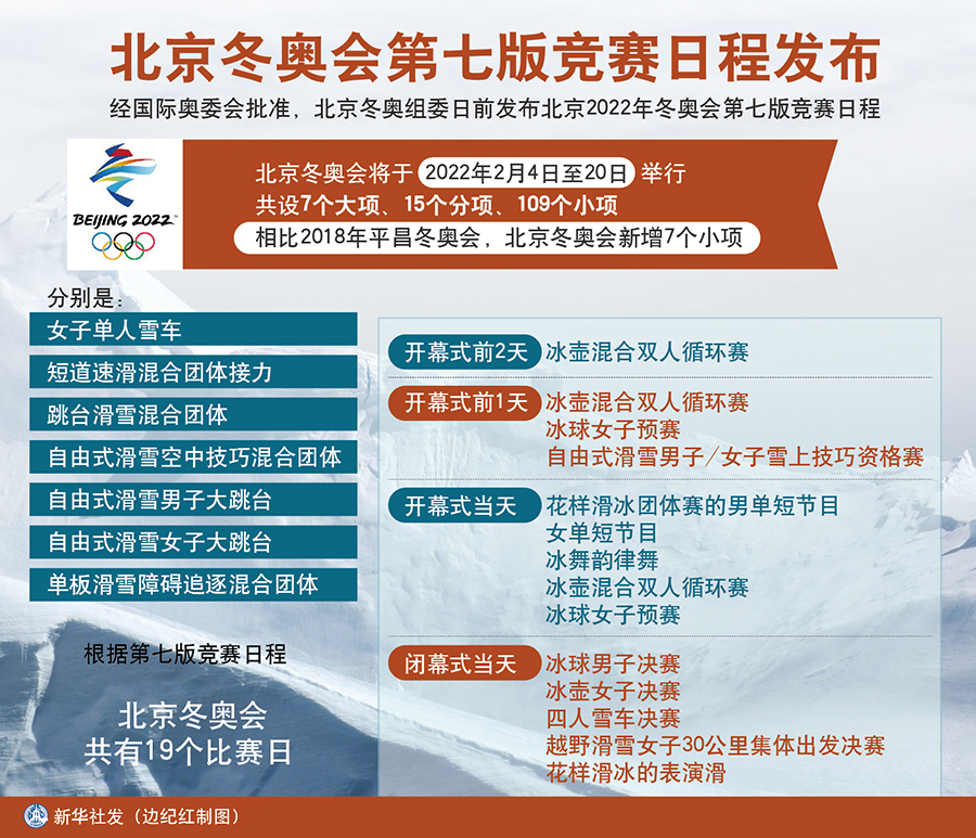 根據(jù)第七版競賽日程,北京冬奧會(huì)共有19個(gè)比賽日。最早的比賽是開幕式前2天進(jìn)行的冰壺混合雙人循環(huán)賽;開幕式前1天將舉行冰壺混合雙人循環(huán)賽、冰球女子預(yù)賽和自由式滑雪男子/女子雪上技巧資格賽;開幕式當(dāng)天將舉行花樣滑冰團(tuán)體賽的男單短節(jié)目、女單短節(jié)目和冰舞韻律舞,冰壺混合雙人循環(huán)賽和冰球女子預(yù)賽;閉幕式當(dāng)天將舉行冰球男子決賽、冰壺女子決賽、四人雪車決賽、越野滑雪女子30公里集體出發(fā)決賽以及花樣滑冰的表演滑。