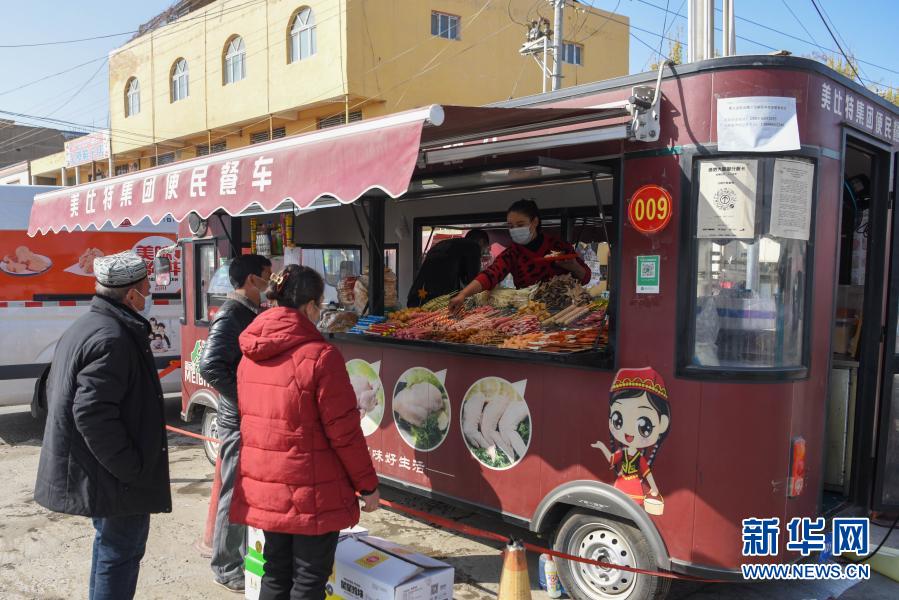 在新疆和田地區(qū)墨玉縣扎瓦鎮(zhèn)客運(yùn)站旁,顧客在便民餐車前購買食品(10月31日攝)。新華社記者 丁磊 攝