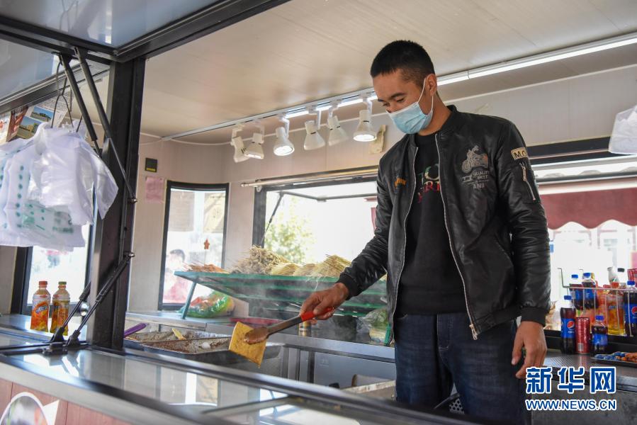在新疆和田地區(qū)墨玉縣扎瓦鎮(zhèn)客運(yùn)站旁,阿卜力孜·阿卜杜克熱木在便民餐車中制作食品(10月31日攝)。新華社記者 丁磊