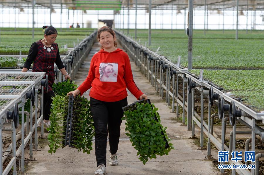 在新疆阿克陶縣現(xiàn)代設(shè)施農(nóng)業(yè)產(chǎn)業(yè)扶貧基地,工人在育苗溫室內(nèi)搬運菜苗(3月22日攝)。新華社記者 丁磊 攝