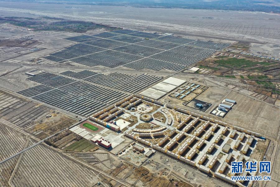 這是新疆阿克陶縣易地扶貧搬遷點的阿克陶縣現(xiàn)代設(shè)施農(nóng)業(yè)產(chǎn)業(yè)扶貧基地和阿克陶縣昆侖佳苑小區(qū)(3月22日攝,無人機照片)。新華社記者 丁磊 攝