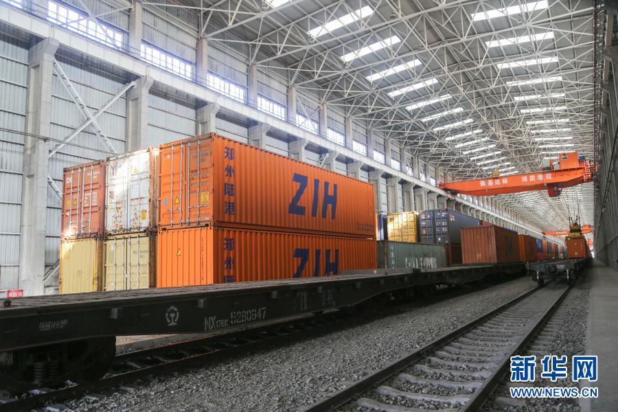 新疆阿拉山口站綜合換裝庫(三區(qū))內(nèi)等待換裝的集裝箱(9月29日攝)。新華社發(fā)(于蘇甫·艾尼 攝)