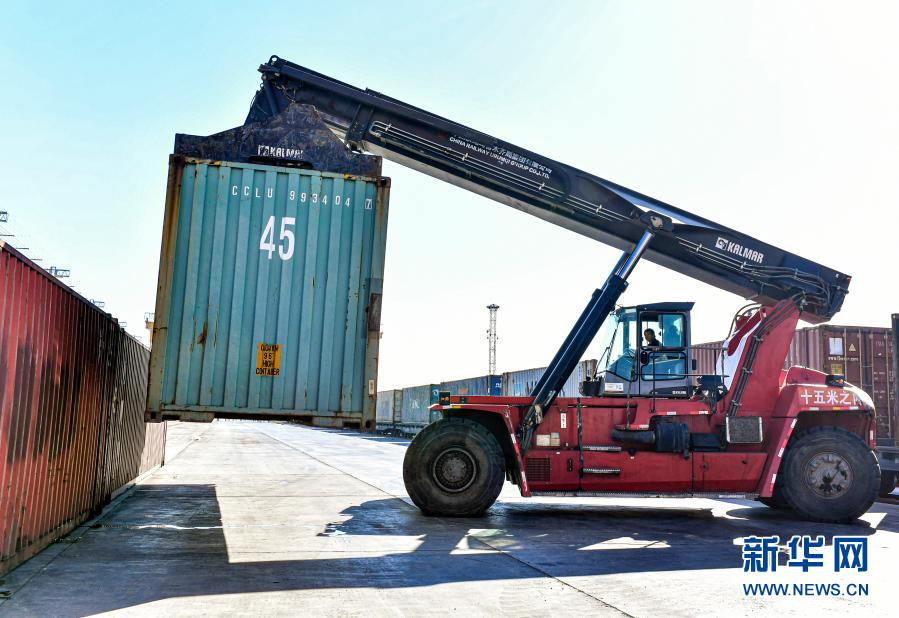 工人在中歐班列烏魯木齊集結(jié)中心吊運貨物(3月12日攝)。新華社記者 王菲 攝