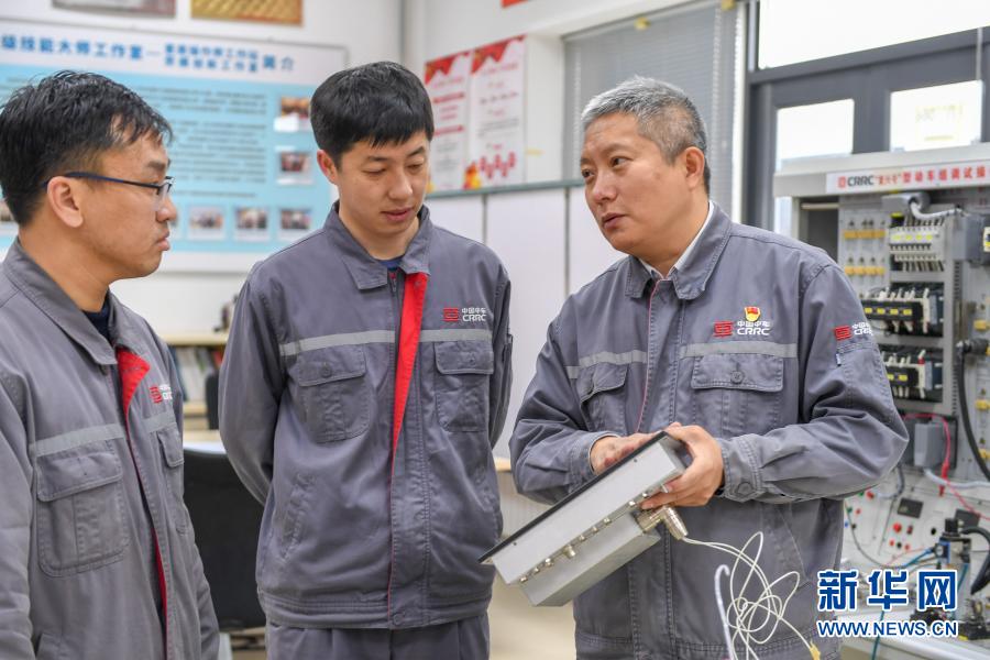 11月25日,在中車長春軌道客車股份有限公司高速動車組制造中心調(diào)試車間,羅昭強(右一)與同事研究高鐵列車網(wǎng)絡(luò)實驗裝置。新華社記者 張楠 攝