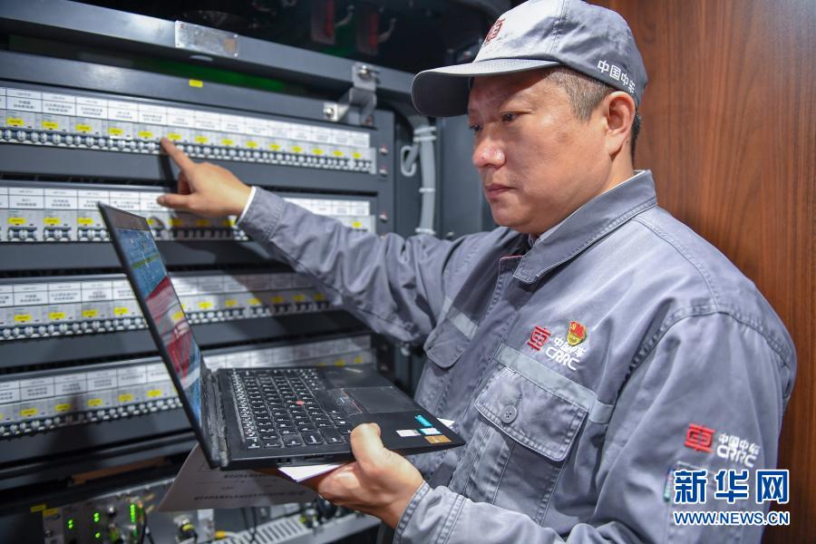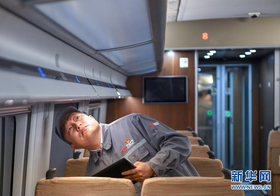 11月25日,在中車長春軌道客車股份有限公司高速動車組制造中心調(diào)試車間,羅昭強檢查復(fù)興號高鐵列車裝置的工作情況。新華社記者 張楠 攝