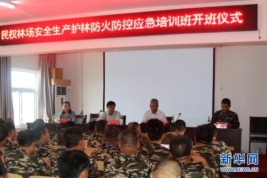 石立忠(臺上左二)和翟文杰(臺上右一)在民權(quán)林場安全生產(chǎn)護(hù)林防火防控應(yīng)急培訓(xùn)班開班儀式上(資料照片)。新華社發(fā)