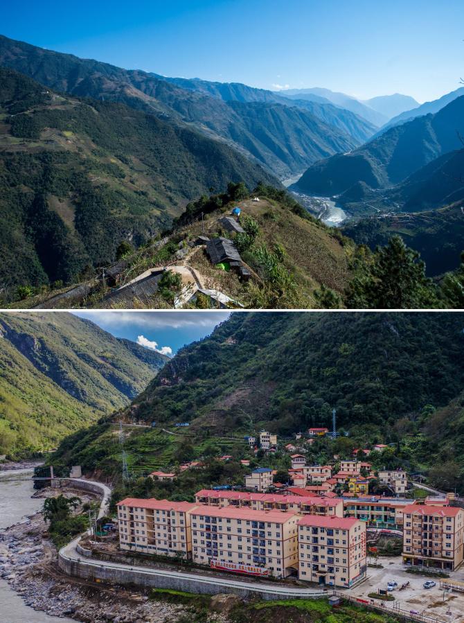 上圖是云南省福貢縣匹河怒族鄉(xiāng)托坪村一景(2016年11月25日攝);下圖是搬遷到怒江邊的托坪村五湖易地扶貧搬遷安置點(diǎn)新村(11月3日攝,無(wú)人機(jī)照片)。新華社記者 胡超 攝