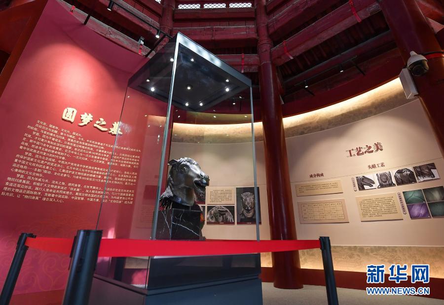 12月1日,馬首銅像在圓明園正覺寺文殊亭陳列展出。新華社記者 李賀 攝