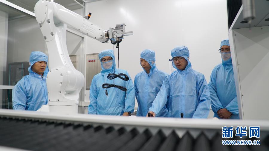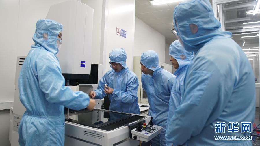 在中科院長(zhǎng)春光機(jī)所,科研人員隋延林(中)和同事們探討科研方案(11月25日攝)。新華社發(fā)(王帆 攝)