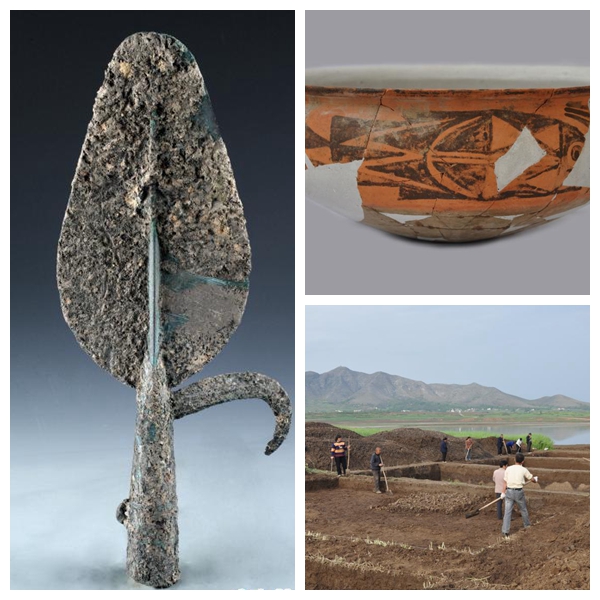 左圖為河南省淅川縣下王崗遺址出土的龍山文化時(shí)期銅矛;右上圖為河南省淅川縣下王崗遺址出土的仰韶文化時(shí)期陶器;右下圖為河南省淅川縣下王崗遺址發(fā)掘現(xiàn)場(chǎng)