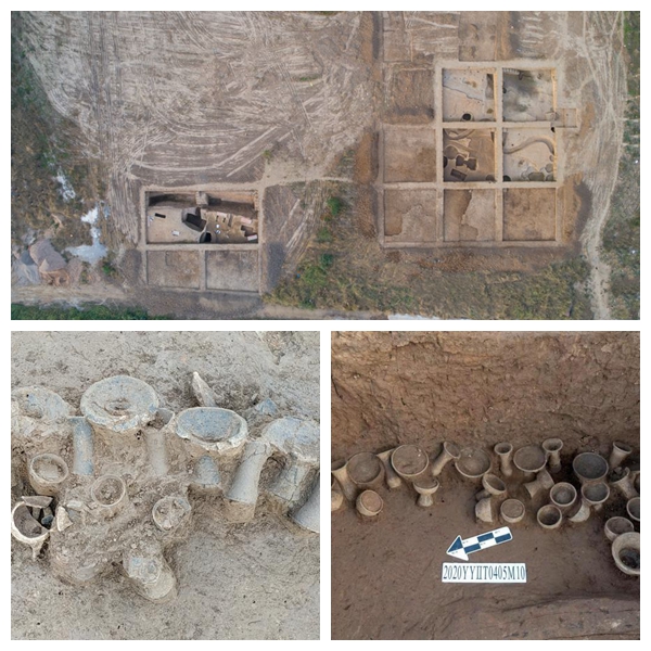 上圖為余莊遺址發(fā)掘區(qū)航拍圖(11月3日攝,無(wú)人機(jī)照片);左下圖為余莊遺址標(biāo)號(hào)為T0405的探方出土的陶器;右下圖為余莊遺址標(biāo)號(hào)為M10的墓葬出土的隨葬陶器