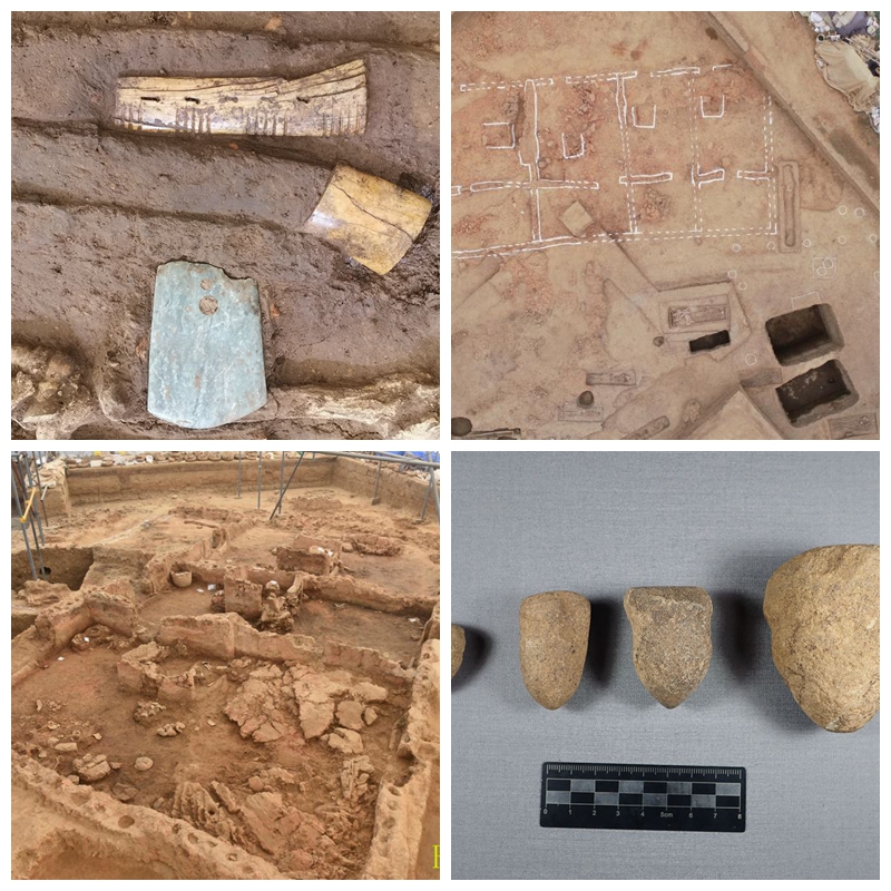 ?左上圖為屈家?guī)XM77中象牙弓飾玉鉞骨樽;右上圖為黃山遺址部分發(fā)掘現(xiàn)場(chǎng)航拍圖;左下圖為黃山遺址出土的仰韶文化晚期的大型玉石器生產(chǎn)作坊;右下圖為黃山遺址出土的石質(zhì)制玉工具——系列石鉆