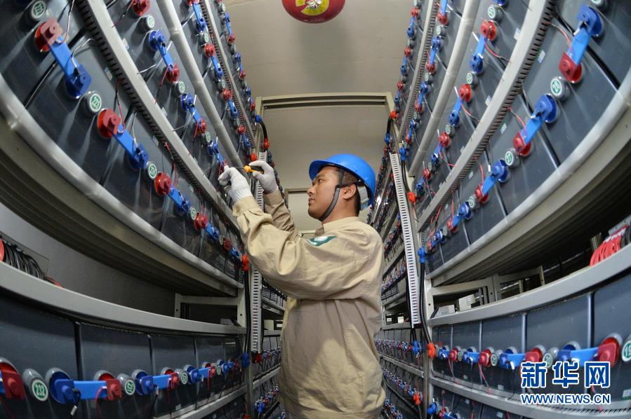 在江蘇省灌云縣開山島,國家電網(wǎng)的施工人員在調(diào)試“風(fēng)光儲(chǔ)互補(bǔ)智能微電網(wǎng)系統(tǒng)”的蓄電池組(2019年6月18日攝)。新華社發(fā)(萬程鵬 攝)