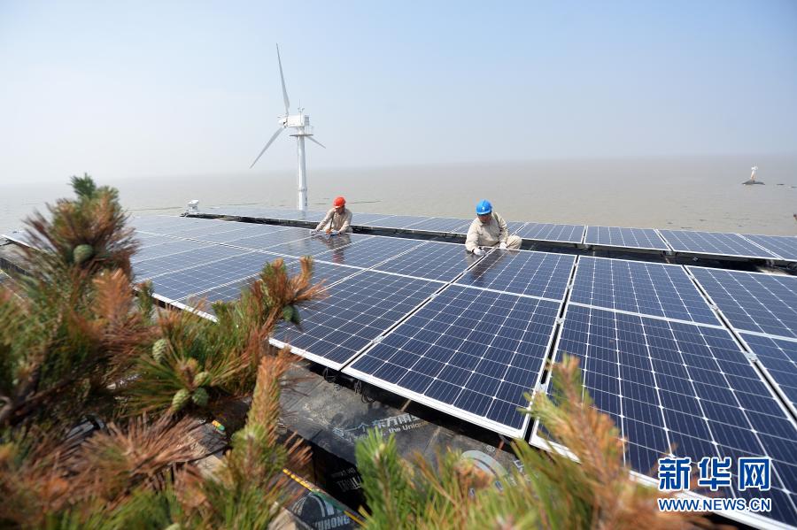 在江蘇省灌云縣開山島,國家電網(wǎng)的施工人員在屋頂上檢查光伏面板運(yùn)行情況(2019年6月18日攝)。新華社發(fā)(萬程鵬 攝)