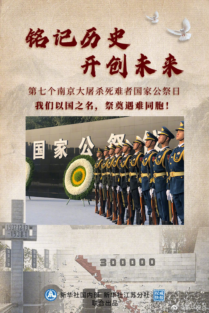 今天是第七個(gè)南京大屠殺死難者國(guó)家公祭日,讓我們銘記83年前的12月13日,沉痛緬懷30萬(wàn)遇難同胞,警鐘長(zhǎng)鳴,珍愛(ài)和平?。ㄓ浾撸菏Y芳、李響、邱冰清 海報(bào)設(shè)計(jì):張惠慧) ????