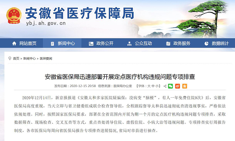 據(jù)安徽省醫(yī)保局網(wǎng)站消息,2020年12月14日,新京報報道《安徽太和多家醫(yī)院疑騙保:沒病變“腦?!?,有人一年免費(fèi)住院9次》后,安徽省醫(yī)保局高度重視,當(dāng)天立即與省衛(wèi)健委組成聯(lián)合檢查督導(dǎo)組,全程跟蹤督導(dǎo)太和縣迅速徹底查清違規(guī)事實(shí),嚴(yán)格依法依規(guī)處理。
