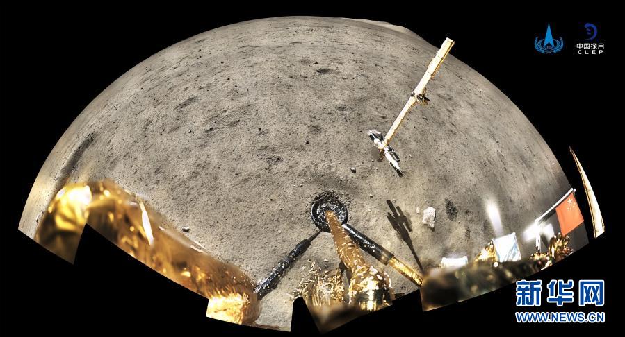 12月4日,國家航天局公布了探月工程嫦娥五號(hào)探測器在月球表面國旗展示的照片。嫦娥五號(hào)著陸器和上升器組合體全景相機(jī)環(huán)拍成像,五星紅旗在月面成功展開,此外圖像上方可見已完成表取采樣的機(jī)械臂及采樣器。新華社發(fā)(國家航天局供圖)
