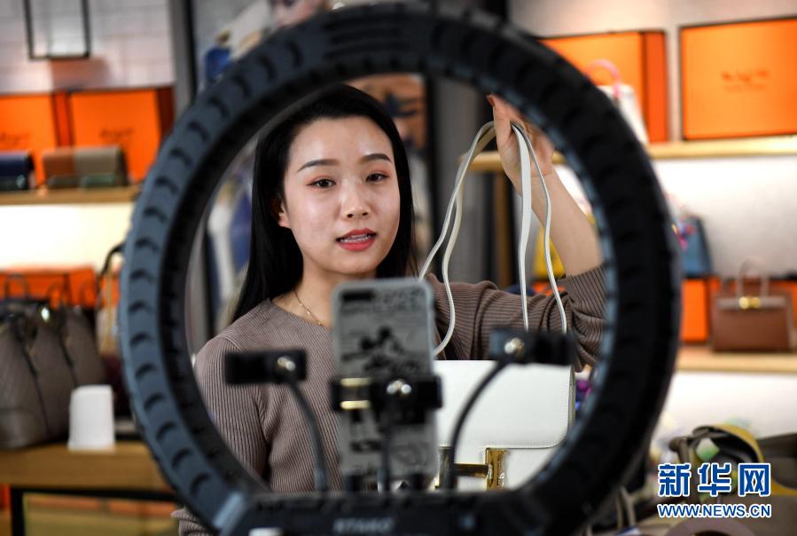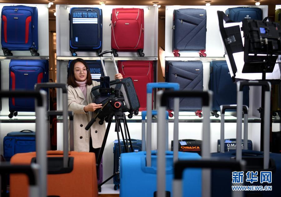12月11日,河北保定白溝新城一家箱包生產(chǎn)企業(yè)的主播在進(jìn)行產(chǎn)品推介和銷(xiāo)售。新華社記者 王曉 攝