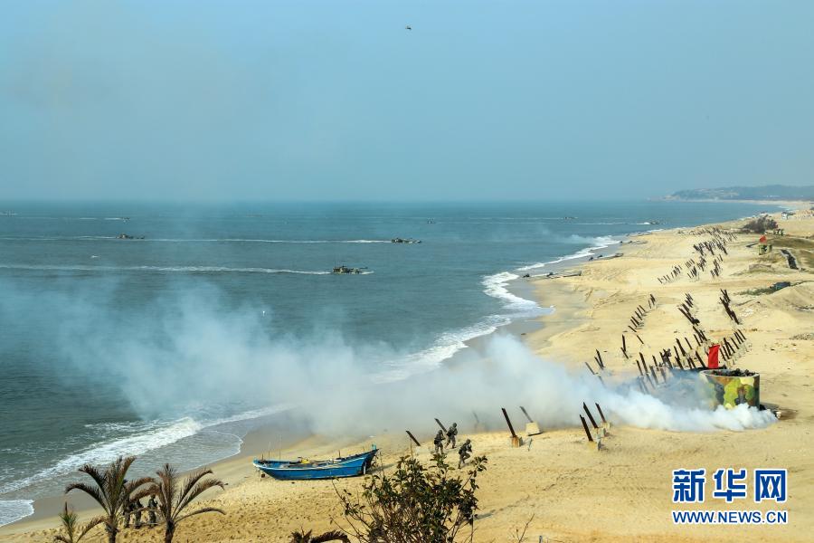 陸軍第72集團軍某旅組織陸空一體實兵演練,藍軍投放煙霧彈干擾紅軍登陸(2017年8月20日攝)。新華社發(fā)(莊林毅 攝)