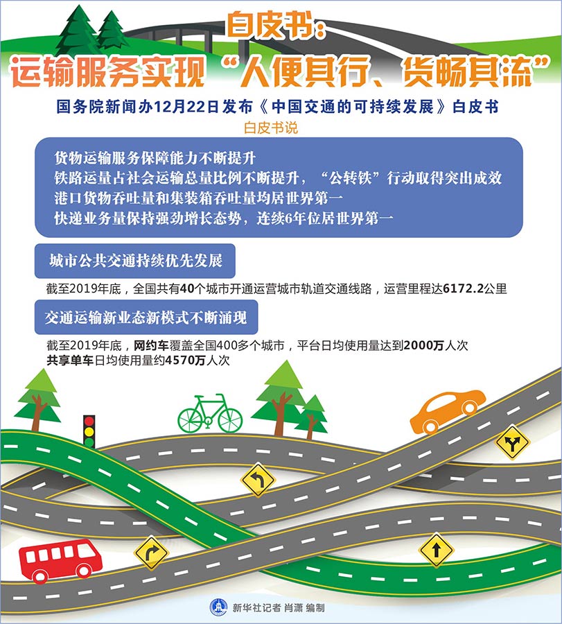 新華社北京12月22日電(記者魏玉坤、周圓)國務(wù)院新聞辦22日發(fā)布的《中國交通的可持續(xù)發(fā)展》白皮書介紹,運(yùn)輸服務(wù)實(shí)現(xiàn)“人便其行、貨暢其流”,通達(dá)性和保障性顯著增強(qiáng)。交通運(yùn)輸對國家經(jīng)濟(jì)社會發(fā)展的支撐顯著增強(qiáng),促投資、促消費(fèi)、穩(wěn)增長作用明顯。