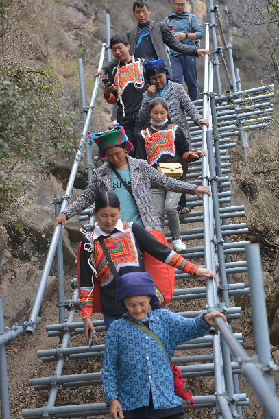 ????2020年5月13日,四川省涼山州昭覺縣支爾莫鄉(xiāng)阿土列爾村31戶村民帶著行李通過鋼梯下山,集中搬遷至昭覺縣易地扶貧搬遷縣城集中安置點(diǎn)的新家。阿土列爾村因位于垂直落差上千米的陡峭懸崖上,曾經(jīng)村民上下山都要在巖壁上攀爬,從而被稱為“懸崖村”。5月14日前,全村84戶建檔立卡貧困戶將陸續(xù)搬進(jìn)縣城新家。張浪 攝