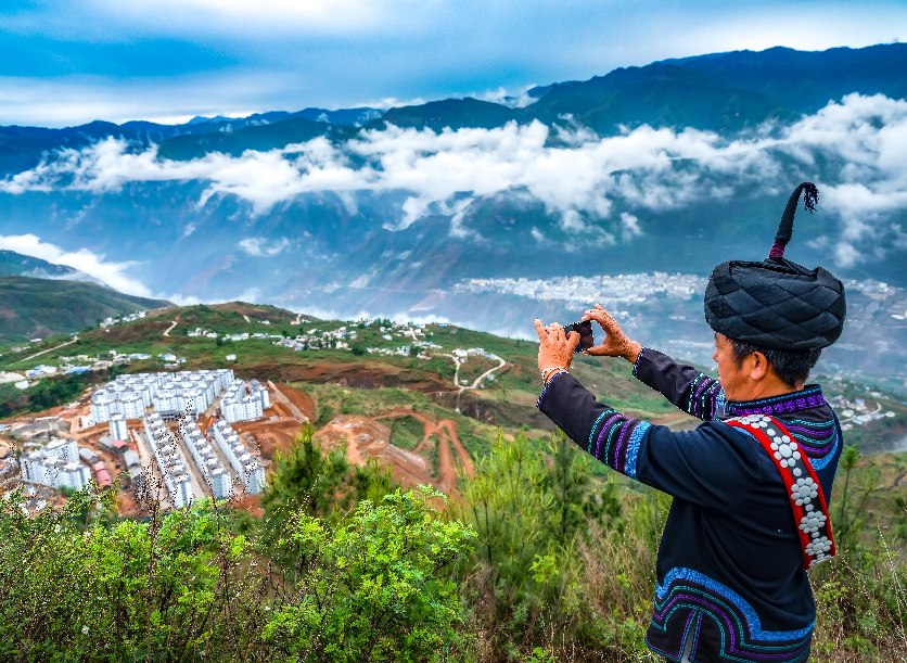????四川涼山彝族自治州金陽縣馬依足鎮(zhèn)“千戶彝寨”東山易地移民社區(qū),占地300余畝,2020年8月完工,已完成安置易地搬遷戶1600多戶。圖為易地搬遷居民在看望即將搬入的新居時,用手機記錄下美麗的新家園。 楊黎明 攝