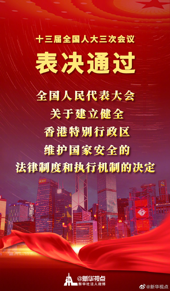 兩會新華社快訊:十三屆全國人大三次會議表決通過了全國人民代表大會關于建立健全香港特別行政區(qū)維護國家安全的法律制度和執(zhí)行機制的決定。
