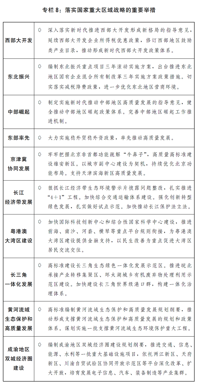 一是落實落細重大區(qū)域發(fā)展戰(zhàn)略。落實區(qū)域協(xié)調發(fā)展新機制,持續(xù)推進西部大開發(fā)形成新格局,支持東北地區(qū)全面振興全方位振興,健全中部地區(qū)崛起政策體系和工作機制,繼續(xù)推動東部地區(qū)率先發(fā)展。縱深推進京津冀協(xié)同發(fā)展,加快實施雄安新區(qū)重點建設項目,完善北京非首都功能疏解政策體系。大力推進長江經(jīng)濟帶生態(tài)環(huán)境突出問題整改和系統(tǒng)性保護修復,加快構建綜合交通運輸體系,促進內河船舶改造。推動粵港澳大灣區(qū)基礎設施互聯(lián)互通,有序開展國際科技創(chuàng)新中心建設,加快橫琴、河套等重大合作平臺建設。高標準建設長三角生態(tài)綠色一體化示范區(qū),推動長三角交通一體化更高質量發(fā)展,建設虹橋國際開放樞紐。抓緊做好黃河流域生態(tài)保護和高質量發(fā)展規(guī)劃綱要編制和出臺實施工作。大力支持成渝地區(qū)雙城經(jīng)濟圈建設,打造全國高質量發(fā)展的重要增長極。積極推進西部陸海新通道建設。深化對口支援。支持少數(shù)民族和民族地區(qū)加快發(fā)展。推動國家級新區(qū)、開發(fā)區(qū)等功能平臺創(chuàng)新提升發(fā)展,加快推進資源型地區(qū)經(jīng)濟轉型和老工業(yè)城市更新改造。推動山西開展能源革命綜合改革試點。繼續(xù)推進承接產業(yè)轉移示范區(qū)建設,在具備條件的內陸城市打造一批高端制造業(yè)基地。制定發(fā)展海洋經(jīng)濟加快建設海洋強國的意見。完善主體功能區(qū)戰(zhàn)略和制度,編制《全國國土空間規(guī)劃綱要(2021-2035)》。