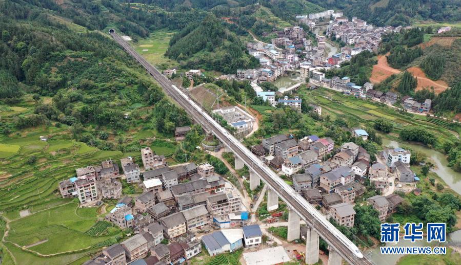 2020年10月4日,一列動(dòng)車(chē)行經(jīng)貴廣高鐵三江侗族自治縣同樂(lè)苗族鄉(xiāng)同樂(lè)村路段(無(wú)人機(jī)照片)。