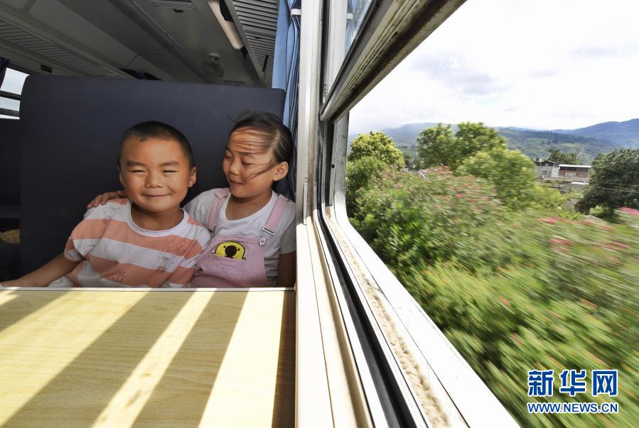 2020年8月14日,吳思語(右)帶著弟弟吳思遠(yuǎn)乘坐“小慢車”前往西昌走親戚。穿越四川涼山彝族自治州往返于普雄和攀枝花之間的5633/5634次列車,全列13節(jié)車廂,走滿全程353公里需要9個(gè)多小時(shí)。慢悠悠的火車沿途要???6個(gè)站,如同一座流動的村莊,盡自己最大能力解決沿途百姓出行問題。