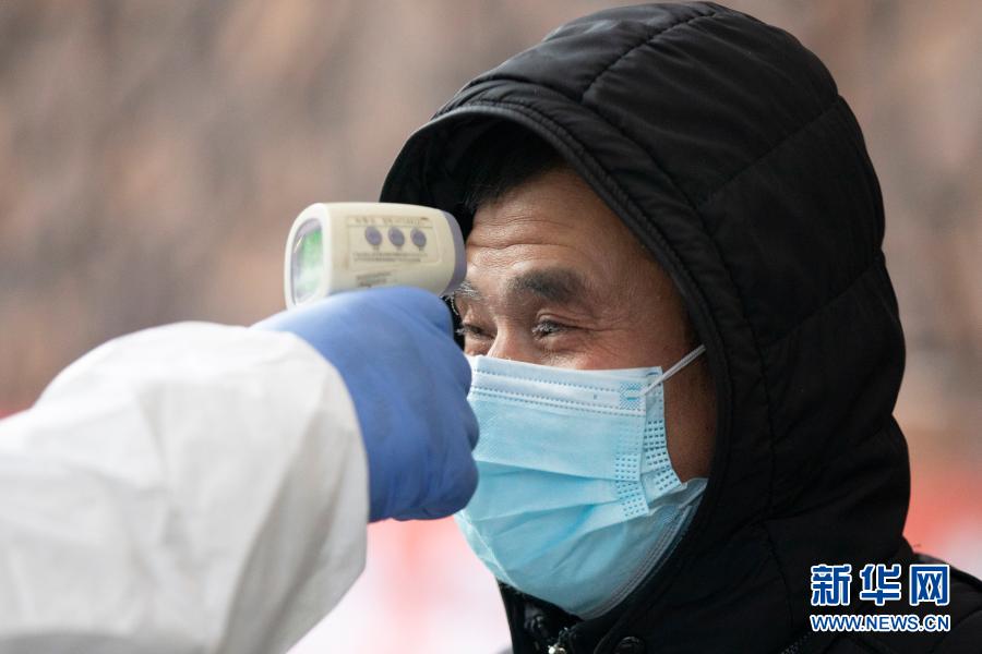 1月15日,志愿者在望奎縣華騰園小區(qū)內(nèi)為居民測(cè)量體溫。 新華社發(fā)(張濤 攝)