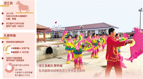 龍江縣是著名的雜糧產(chǎn)區(qū)、畜牧大縣。如今,龍江和牛已成為龍江縣畜牧產(chǎn)業(yè)的一張名片,帶領(lǐng)群眾走上致富路?!拔覀冄芯恐贫恕陡邫n肉牛優(yōu)勢特色產(chǎn)業(yè)集群建設(shè)方案》,從2016年起出臺了扶持政策?!饼埥h委副書記孫立軍告訴記者,當?shù)匾龑髽I(yè)與農(nóng)戶合作養(yǎng)牛,農(nóng)戶每購買兩頭母牛,政府會給予一定的補貼款。此外,政府還向企業(yè)采購凍精幫助農(nóng)戶繁育小牛,小牛犢生長到6個月達標后,由企業(yè)統(tǒng)一收購,價格在1.2萬元至1.4萬元不等。